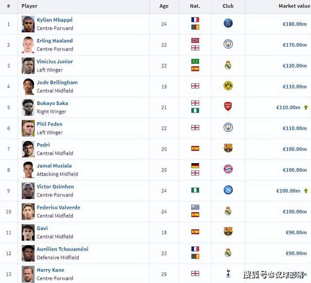 排在姆巴佩之后的是身价1.7亿欧的曼城锋霸哈兰德,两人仅差1000万欧,哈兰德更为年轻,未来要超越姆巴佩,寄望拿下欧冠冠军、金球奖、世界足球先生,因为挪威国家队的实力有限,让哈兰德无望捧起大力神杯。