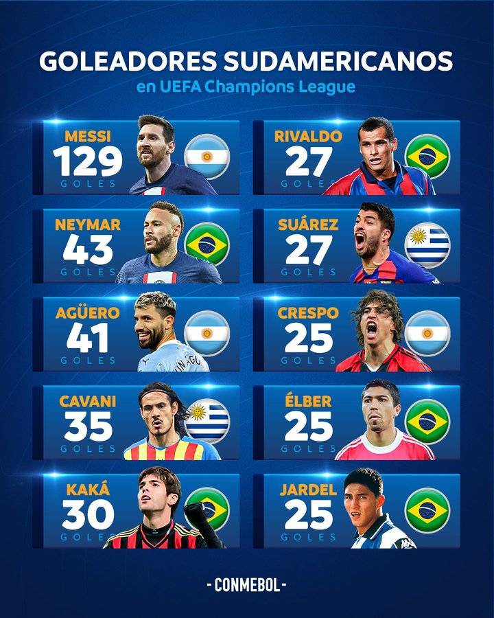 欧冠南美球员射手榜梅西129球居首,内马尔、阿坤分列二三