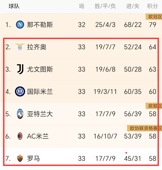 截至目前,意甲第33轮已经结束了8场比赛,这一夜尤文、国米、拉齐奥和亚特兰大等4支球队,都顺利拿到了3分,而AC米兰和罗马,则不幸爆冷,目前6支争四球队,最大差距是6分,拉齐奥已经开始和身后的对手,拉开了距离。