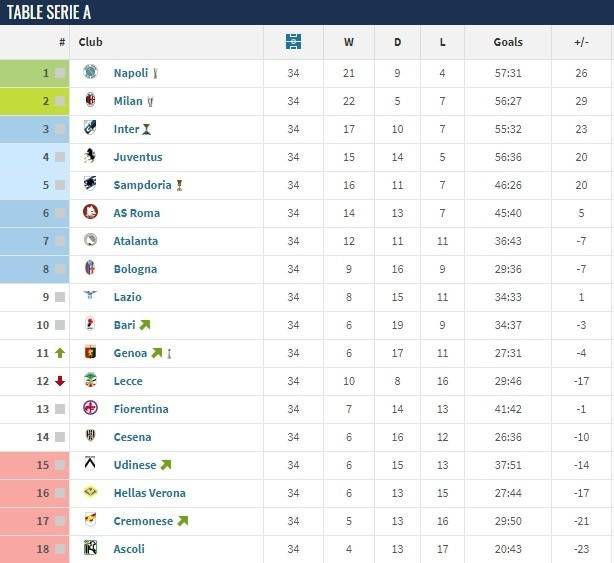 那不勒斯上次夺冠时的意甲:米兰两分之差位居第二,国米第三