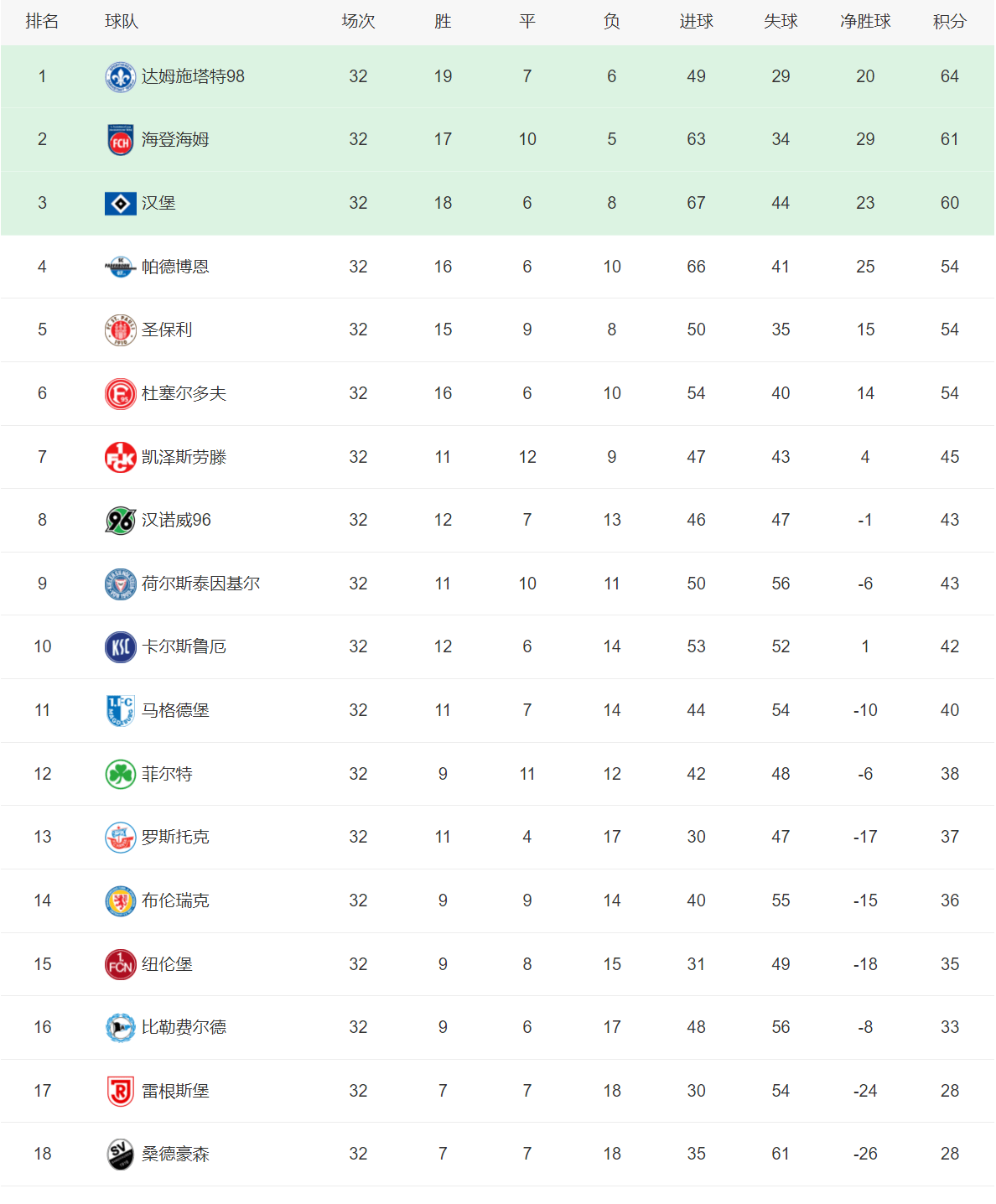 德乙联赛积分榜