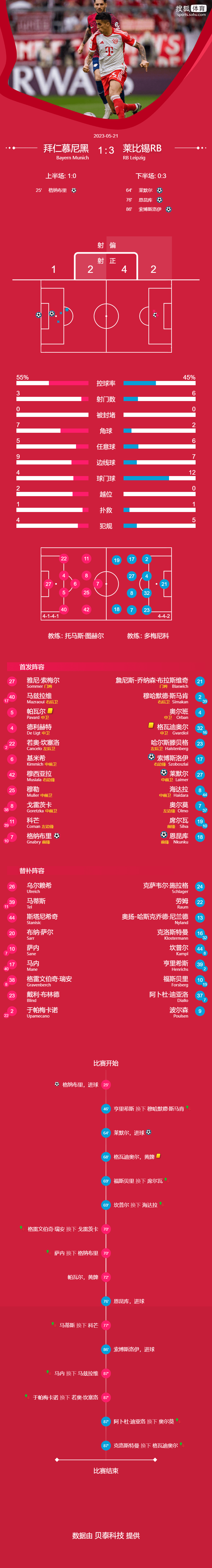 德甲第33轮拜仁主场1-3莱比锡格纳布里破门恩昆库传射索博斯洛伊点射 |