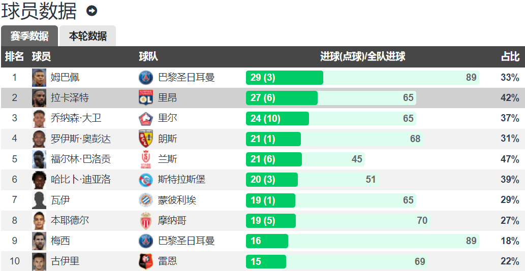 姆巴佩连续5个赛季成为法甲金靴本赛季七大联赛最多射正
