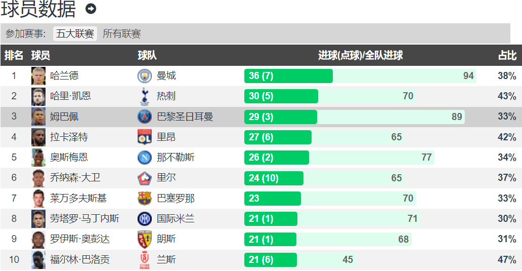 智道的观点:法甲联赛的数据未必是数据!法甲就是强行五大联赛的存在,姆巴佩本赛季在法甲79次射正打入29球,凯恩在英超63次射正打入30球,哈兰德在英超60次射正打入36球,仅此可见哈兰德的射正转化率更高。
