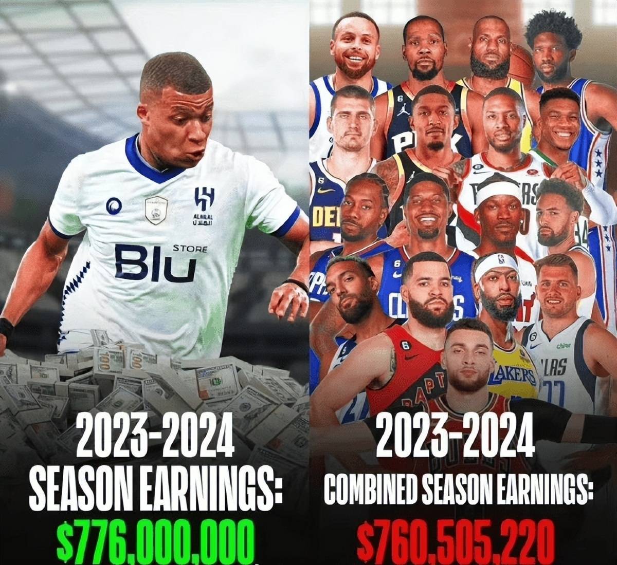 抛开姆巴佩这个并不能确定真实性的合同不谈,足球球星的顶薪合同大于NBA是客观存在的事实。