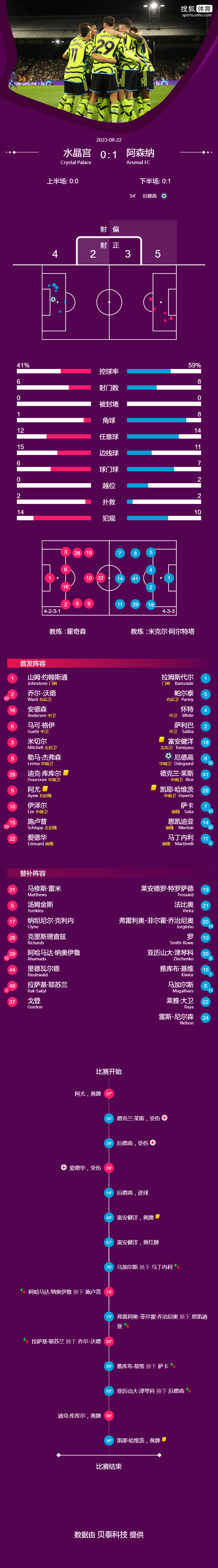 英超第2轮阿森纳1-0水晶宫厄德高点射富安健洋染红 |