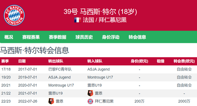特尔出自法甲雷恩青训,球员于去年夏窗以2000万欧元的转会费从雷恩加盟拜仁,今年夏窗,拜仁一度想要出售特尔,还好留了下来。