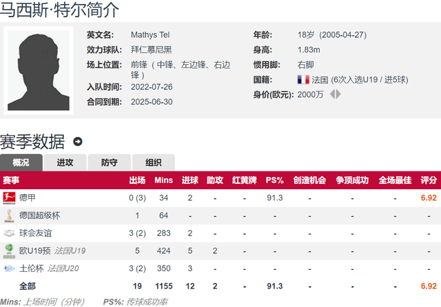 现年18岁的特尔,身高1.83米,右脚球员,主打中锋位置,也可以踢边锋,与拜仁的合同至2025年,目前球员在德转的身价为2000万欧元。特尔本赛季德甲替补出场3次,合计34分钟,打入了2球;上赛季德甲出场22次,其中仅有1次首发,合计出场397分钟,打入了5球。
