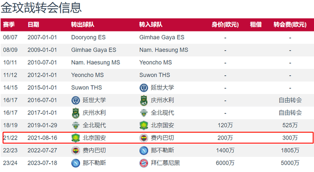 金玟哉于2021年夏窗以300万欧元的转会费从北京国安加盟土超费内巴切,当时金玟哉的身价仅为200万欧元。金玟哉以土超作为跳板,在费内巴切效力一个赛季之后,于去年夏窗以1805万欧元的转会费加盟意甲那不勒斯,当时金玟哉的身价已经涨至1400万欧元。金玟哉在意甲一个赛季,就以主力中卫的身份帮助那不勒斯时隔33年重夺意甲冠军,个人荣膺意甲2022-23赛季最佳后卫。今年夏窗,金玟哉以5000万欧元的转会费加盟德甲巨人拜仁,此刻金玟哉的身价已经暴涨至6000万欧元,是身价最高的亚洲球员,名副其实的亚洲一哥。