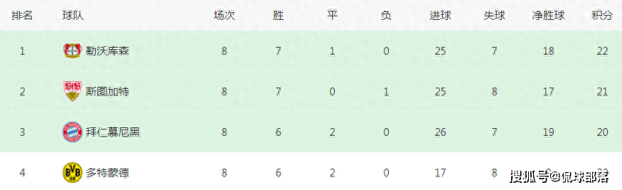 随着拜仁击败美因茨之后,这一轮积分榜前四的球队排名不变,具体为勒沃库森积22分、斯图加特积21分、拜仁和多特同积20分,最大分差还是2分,拜仁作为卫冕冠军,真正感受到了压力。