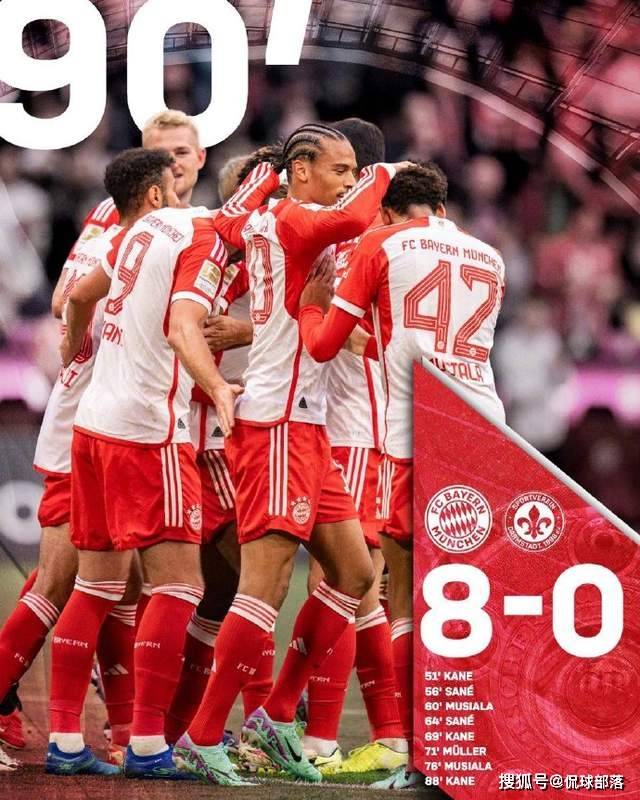 上半场两队总共被红牌罚下3人情况下,拜仁在下半场疯狂吊打达姆施塔特,一共4人同时破门,包括凯恩上演帽子戏法,穆西亚拉、萨内同时梅开二度,以及穆勒锦上添花,帮助拜仁8-0狂胜达姆施塔特。
