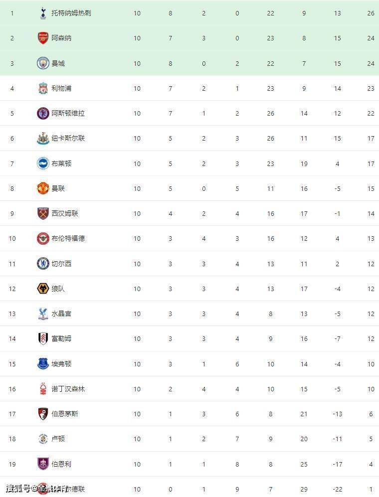 积分榜方面,曼城队赢下曼市德比之后积分达到24分,暂时以净胜球劣势排在阿森纳之后位列第3。利物浦大胜之后积23分,排名积分榜第4的位置。阿斯顿维拉积22分紧随其后,暂时排名积分榜第5位。曼联遭遇赛季第5场失利,排名积分榜第8位。
