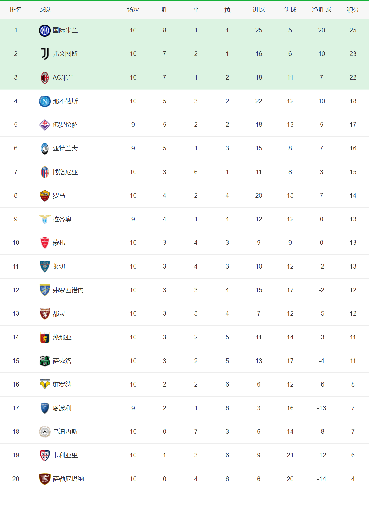 本轮国际米兰小胜罗马,斩获3连胜继续领跑意甲,争冠希望较大。国际米兰在攻防两端都表现得极其出色, 在意甲各队中进球数最多和丢球数最少。尤文图斯好在是家底厚实,上赛季被那么折腾也没有动到根基,目前落后国际米兰2分。不过尤文的情况依然比较复杂,就怕中途又整出幺蛾子。