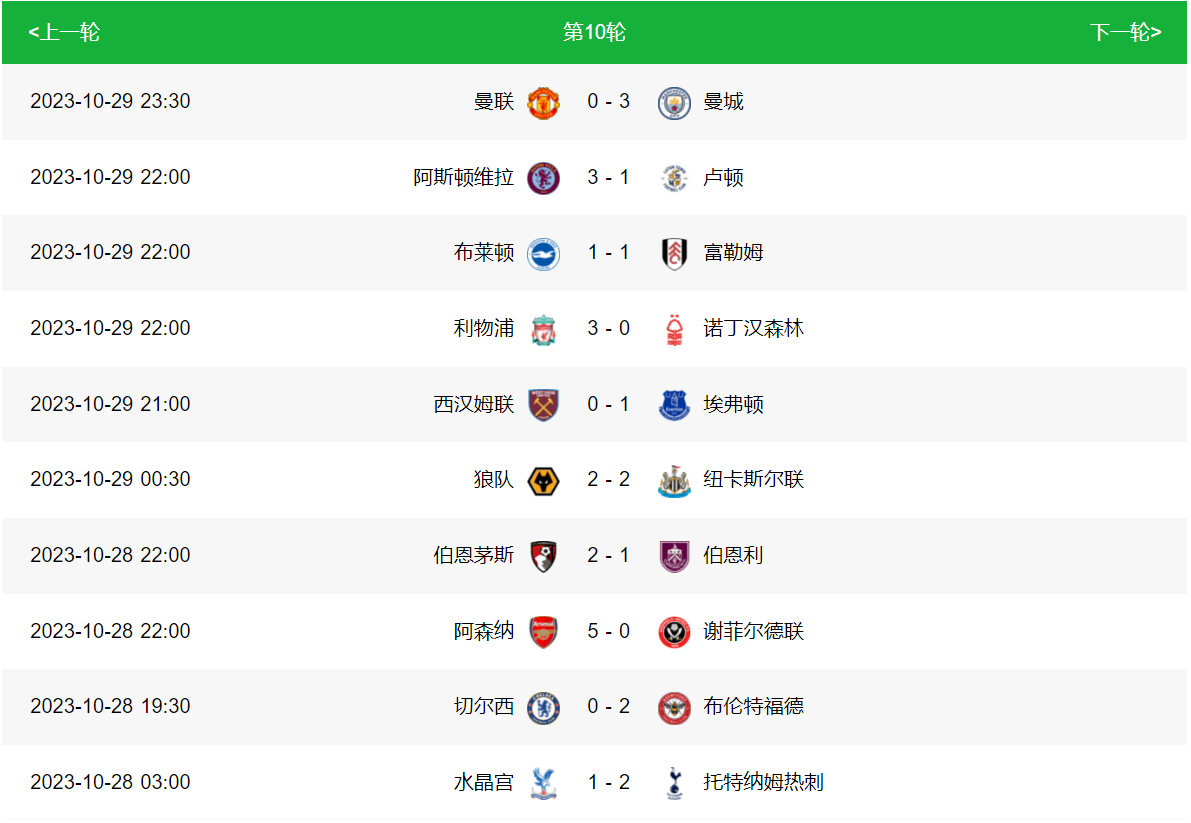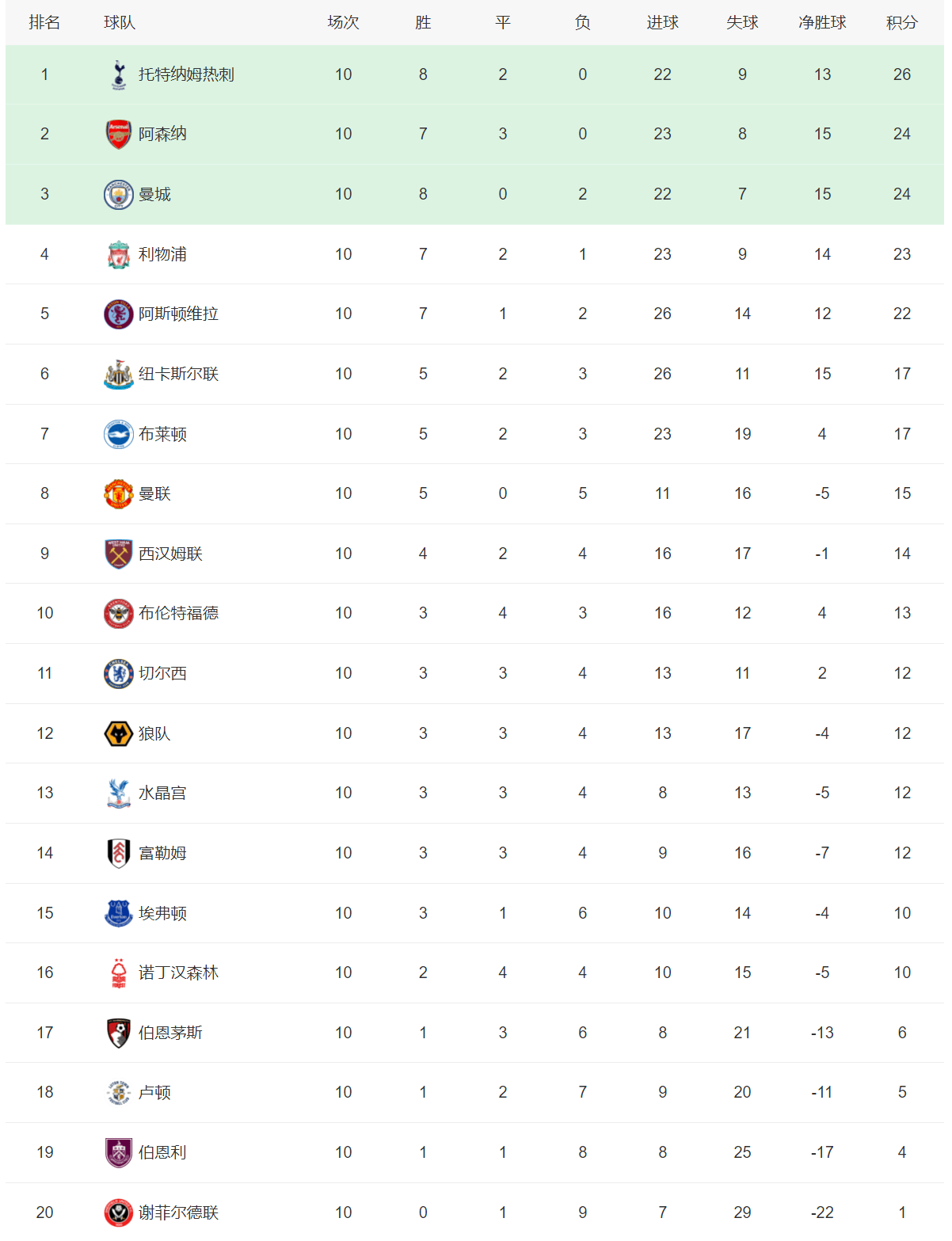 热刺本轮客胜水晶宫,斩获4连胜+10轮不败,继续领跑英超积分榜。接下来热刺的赛程相对比较难,不过没有欧战牵制,可以全力以赴应对联赛。阿森纳、曼城排名紧随其后,其中阿森纳也10轮不败,北伦敦双雄皆表现抢眼。本轮曼城赢下曼市德比,哈兰德梅开二度,曼城依然英超最大的争冠热门。