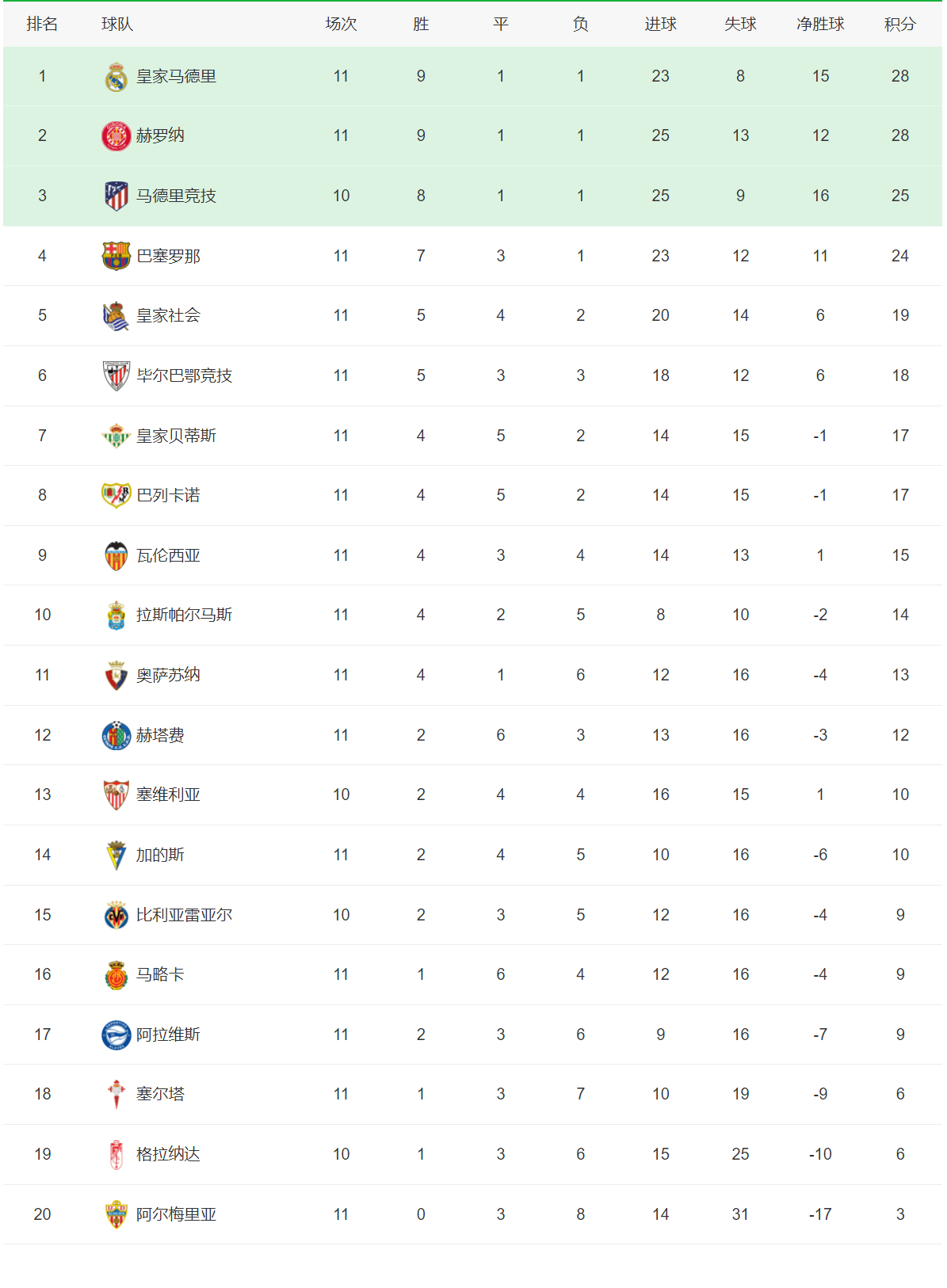 本轮西甲迎来国家德比,由于诺坎普球场翻新,巴萨坐镇巴塞罗那奥林匹克体育场,未能压住对手的气势,还目送贝林厄姆新王登基。由于输掉国家德比,巴萨落后皇马达到4分,显然暂时无法回归榜首。不过皇马并未独占鳌头,领先赫罗纳仅是净胜球优势,榜首位置并不稳,稍不注意就被对手超越。