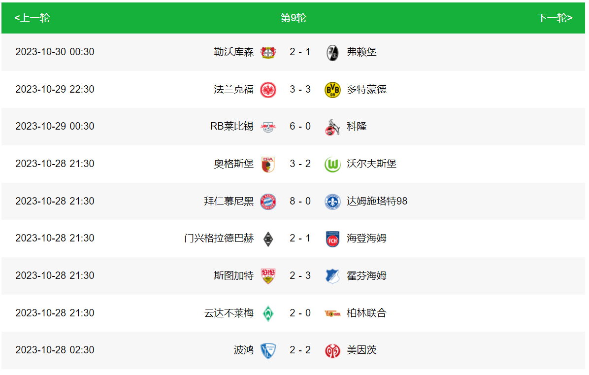 本轮拜仁慕尼黑8-0横扫升班马,凯恩打进3球,力助球队斩获联赛3连胜。不过拜仁还是没能回到榜首,目前被勒沃库森压着。拜仁和勒沃库森目前都是不败战绩,勒沃库森8胜1平表现更加出色,力压拜仁排名榜首。勒沃库森在欧联杯的表现同样不俗,前三轮小组赛取得3连胜,大概率获得该小组第一。