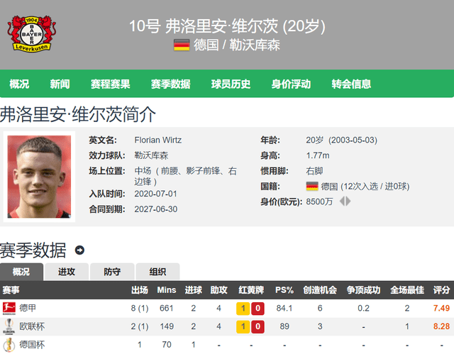 现年20岁的维尔茨,身高1.77米,右脚球员,主打前腰位置,也可以踢影子前锋和右边锋,与勒沃库森的合同至2027年,目前球员在德转的身价为8500万欧元。维尔茨伤愈复出之后,本赛季保持着好状态,各项赛事13场5球8助。