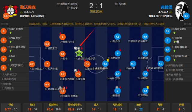 在德甲第9轮的最后一场比赛中,勒沃库森主场2-1击败弗赖堡,重新登顶德甲积分榜,力压拜仁2分领跑。此役,20岁的德国中场维尔茨传射建功。据数据统计,维尔茨在勒沃库森最近7个进球中,直接参与了6球,贡献2球4助,不得不说维尔茨就是药厂的最强火力,阿隆索的战术核心。