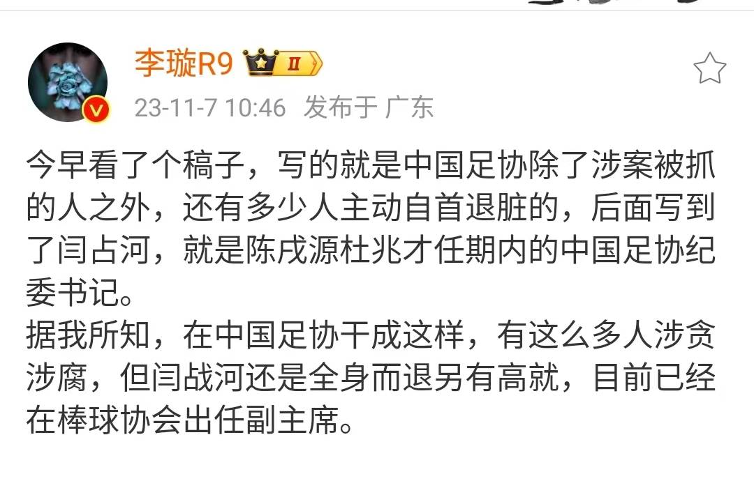 为什么呢?近期,根据名记李璇的报道,此前曾经被多次举报的足协纪检一把手闫占河履新了。众所皆知,此前因为足协的高层几乎被抓空,而作为纪检的闫占河也是受到了极大的质疑,甚至很多球迷认为他即便没有牵扯也是失职,不过根据李璇的报道,此次闫占河并没有被追究,目前,闫占河已经上任了中国棒球协会的副会长,离任了足协。