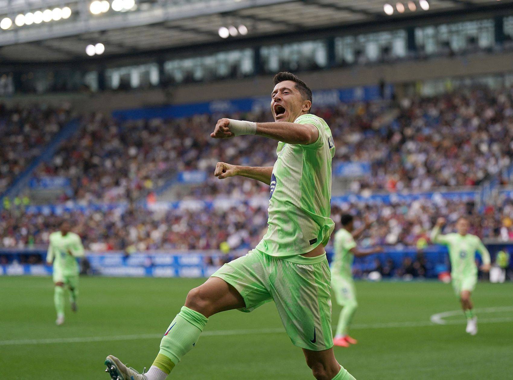 第23分钟,巴萨后场大脚策动反击,随后拉菲尼亚单刀突入禁区打门被扑。第32分钟,埃里克-加西亚中路斜塞给到禁区,莱万快速抢射破门,3-0!仅仅30分钟过后,莱万就闪电完成帽子戏法!