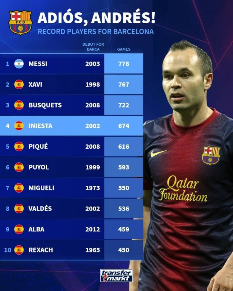 直播吧10月8日讯 根据多家媒体的报道,西班牙传奇球星伊涅斯塔即将宣布退役,德国转会市场列出了巴萨队史出场次数排名,梅西以778场居首,伊涅斯塔674场排名第四位。