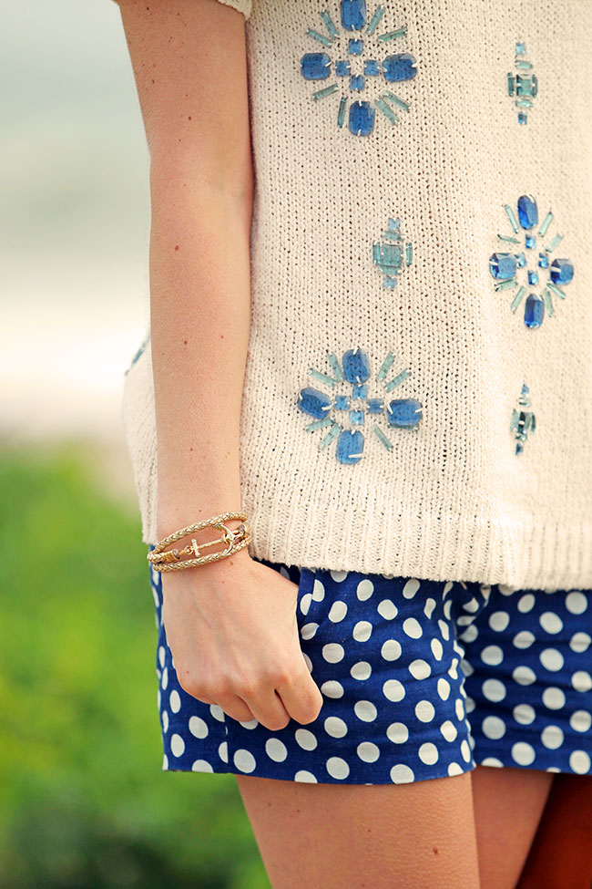 大圆点的可爱系短裤搭配白色的夏季针织衫。波西米亚风的手链,也是夏季必备的时尚单品。
