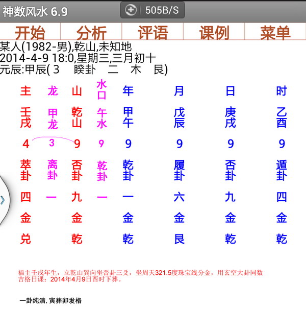 福主壬戌年生,立乾山巽向坐否卦三爻,坐周天318.5度,用玄空大卦同数吉格日课:2014年4月9日酉时下葬。