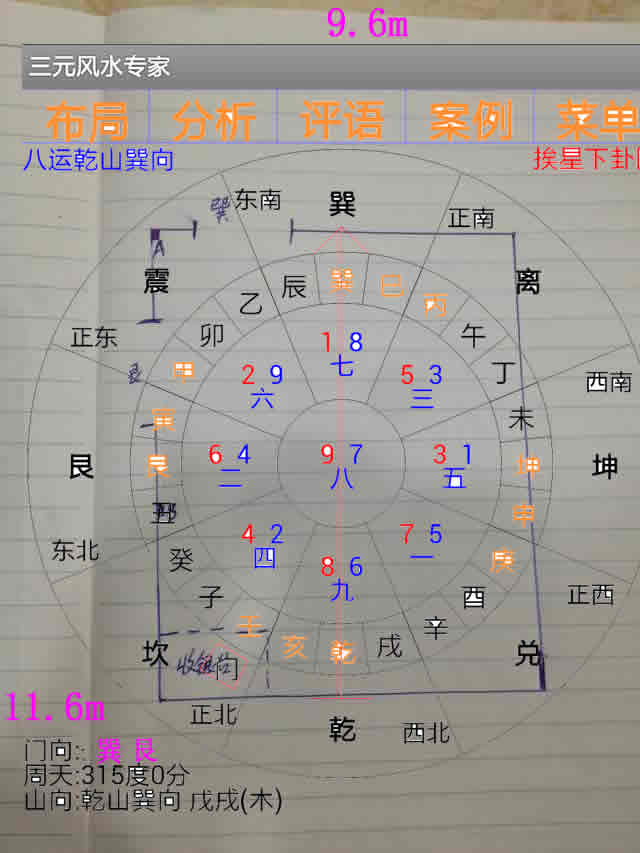 客户开的是服装批发店,在市场的二楼,面积111平方,长11.6米,宽9.6米,开了两个门,同样大小是2.4米宽,一个门乾山巽向130度兼辰向,另一门坤山艮向。市场2007年建,2009年开业,是八运酉山卯向。