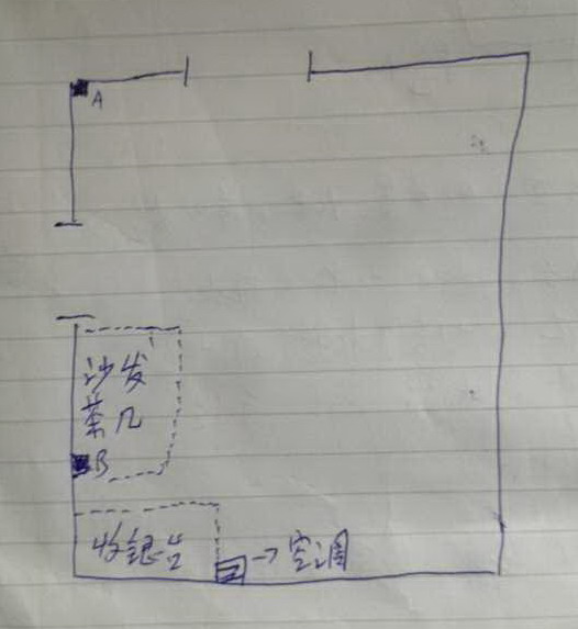 收银台在正北方,靠东北方有沙发茶几,其它为服装展销处。