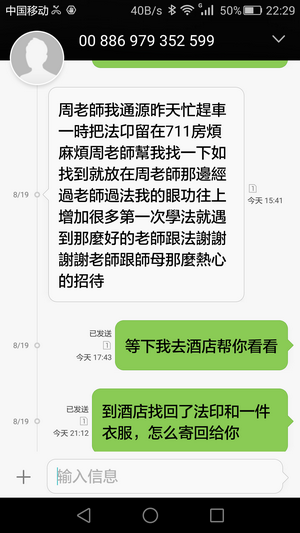 台湾学员张通源,急着赶坐飞机回台湾,把法印忘拿,留在酒店,据他反馈通过授记之后,他的眼功提升了不少。