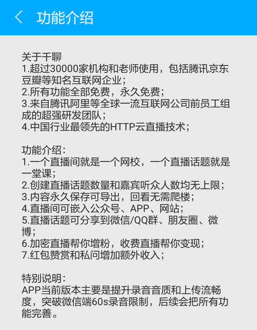 千聊直播是微信上最好用的直播平台,完全免费。千聊直播创始团队来自全球一流的互联网公司前员工,从2015年年底开始专注于微信生态内在线分享交流平台的打造,致力于为社群运营者、培训老师、微信群主、自媒体从业者提供讲课、多人沟通、用户管理以及变现等最齐全最有效率的平台。团队拥有丰富的社交产品、在线直播、客户运营、社会化营销和互联网商业服务经验。