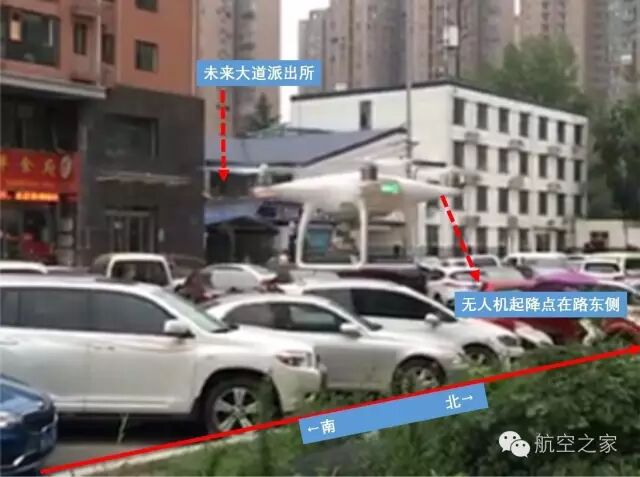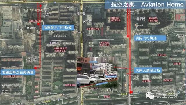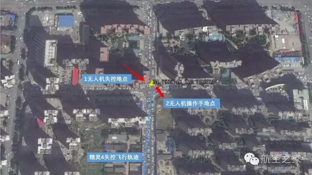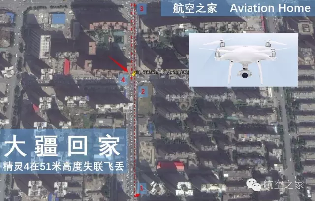 在最终4号失联点悬停时,高度在20米~51米之间,卫星数始终保持在10颗以上,无人机电量为47%~41%衰减区间。在此十字路口,无人机操作手在2点,准备升空稍高位置拍摄全景照片,在51米处突然失联,加速向南飞,期间遥控器没有联系上精灵4。
