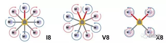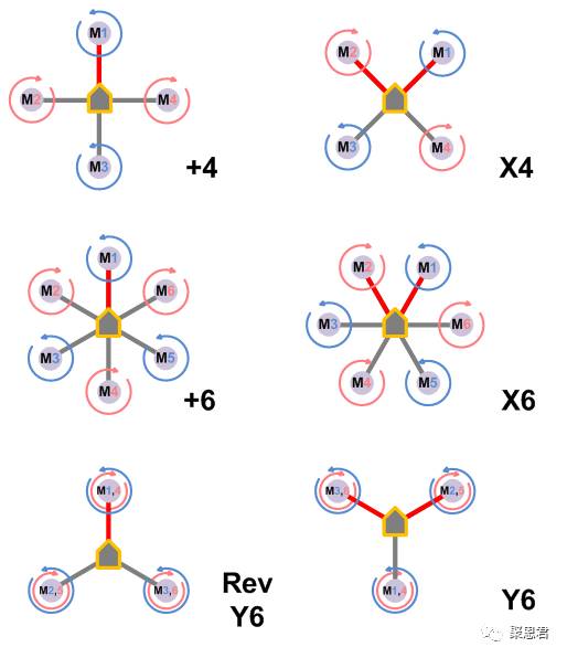 以下是多旋翼布局的主要样式。其中,红、蓝表示旋转方向相反,Rev Y6、Y6、X8为同轴双旋翼。