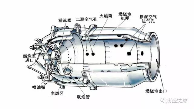 燃烧室是将压气机出来的高压空气与燃料混合并进行燃烧的装置。在燃烧室里,燃料(如航空煤油)中的化学能经燃烧转变为热能,使气体温度大大增高。