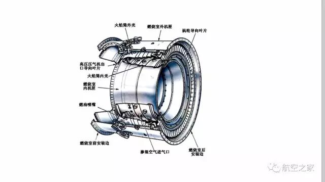 在火焰筒外壳外面围绕一个环形的外机匣,在火焰筒内壳里面装有一个环形的内机匣,因此,整个燃烧室是由4个同心圆环组成的。