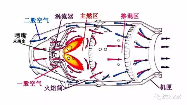 另一股由燃烧室外套与火焰筒间形成的环形道中向后流动,以冷却火焰筒,最后由火焰筒后部的孔进入火焰筒内,与燃烧区的第一股燃烧后的高温气流掺混,将燃烧室出口的燃气温度降低到涡轮能承受的温度,并使燃烧室出口温度场均匀,然后再流向涡轮。