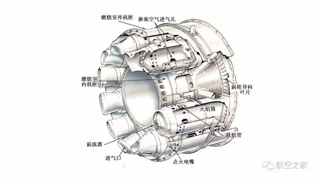 它的火焰筒由两个围绕发动机轴线的同心圆壳体所组成,形成一个环形腔道,内、外壳体分别称为火焰筒内、外壳。