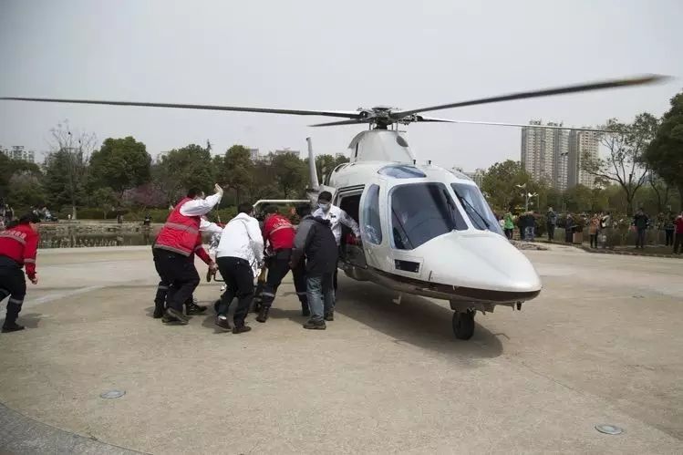 15时14分,一架直升机降落在双虹路上的临时起降点,将“伤员”快速转运到直升机中后,15时17分,直升机起飞升空。15时20分,在市人民医院急诊中心门前,直升机出现在视野中,只见它干净利落地停在了画着醒目“十字”的停机坪上。早在一旁等待的急诊科4位医护人员立刻推着抢救床奔向直升机。机舱一打开,急诊人员快速将“伤员”转运到抢救床上,立即向急诊室奔去。