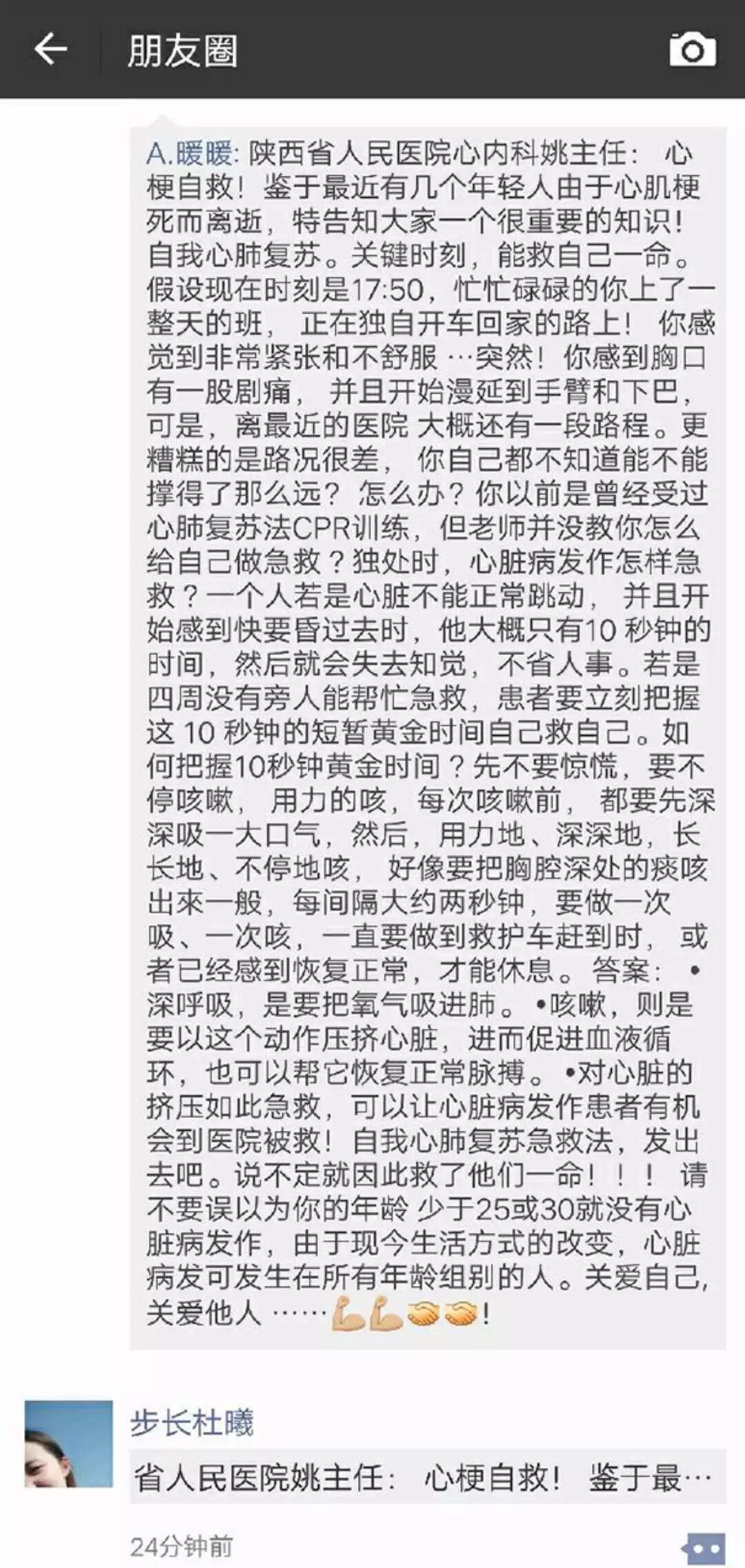 这则消息提到的症状“突发胸痛,蔓延到手臂和下巴……”,是心绞痛或急性心肌梗死,而非心脏骤停。可疑心绞痛或者心梗发作,自救方法主要是:绝对静卧休息、拨打急救电话、嚼服300mg阿司匹林(排除阿司匹林过敏史、近期胃肠出血史及脑卒中征象等),可在血压不低、没有特殊禁忌的状态下尝试含服硝酸甘油1-2片。此时血管狭窄或完全堵塞,心肌缺血缺氧,而如果在此时频繁用力咳嗽,会进一步加重心肌耗氧从而恶化病情,诱发恶性心律失常甚至室颤心脏骤停。
