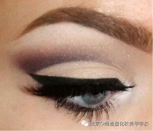 第六步:用比较粗黑的眼线笔画夸张眼线,眼线的宽度要覆盖住双眼皮的宽度,眼线与眼影的区域直接连成一个夸张的眼线区,用粗黑的眼线笔填充。