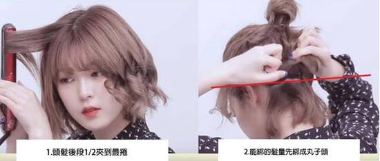 造型技巧:首先,利用电棒卷或直板夹,在发丝的中段到发尾卷出超级卷的卷发,且不能拉松;再将2/3以上的头发绑起来,见图中红线处的上方,自然固定一下!最后,将卡在脖子附近的头发用小黑夹向上卡住,制造出丰盈感十足的丸子头。这款发型不需要担心头发太短,落发太凌乱等问题哦,因为它本身为了增加丸子的蓬松感,就需要制造出卷度,只需用小黑夹将所有的头发都卡在丸子周围即可。