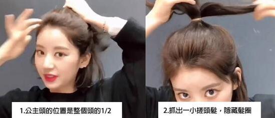 造型技巧:公主头的位置是抓起脑后1/2的发量,并将绑好的公主拉出一小缕头发,绕着发圈绑,再将发圈隐藏,这样看起来会更加自然!需要注意的是额头与耳朵的发际线,记得要留出一些小碎发,这样看起来脸会更小更精致。
