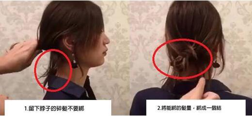 造型技巧:只需在靠近脖子的地方留下绑不起来的头发,剩下的就像我们用橡皮筋绑住塑料袋的方式一样,让头发绕个弯再固定,就能绑出一小小颗的结哦!如果觉得这样的发型有点太随兴,可再将脖子附近的头发向上扭进发圈里,试试吧!