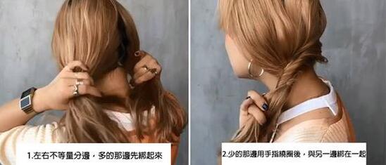 造型技巧:只需将头发分成左右不等发量,并将多的那边绑起来固定在单侧(左边多就固定在左侧),少量的头发则先用手指绕成发辫后,再与发量多的那边结合就好啦!这款造型特别适合搭配贝蕾帽、棒球帽,让你瞬间人气爆棚!