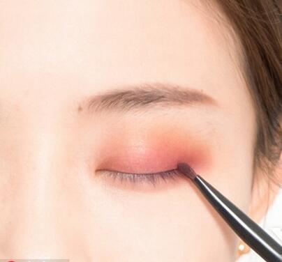 3.换一把小号眼影刷,沾取较深的桃粉色眼影,沿着睫毛根部向上进行晕染。