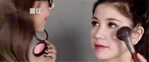 涂腮红:接下来我们要做的就是涂腮红,又称为胭脂,使用后会使面颊呈现健康红润的颜色。