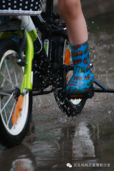 我知道花生是专为寻找大水洼而去。他爱极了骑着自行车或滑板车从水池中快速冲过,然后回过头欣赏车轮激起的水花以及在路上留下的轨迹,在他心中这一定代表着什么。