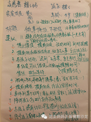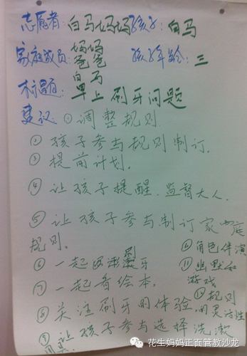 花生妈妈带领我们情景再现了这一幕,由我扮演白马。然后一起讨论,真的特别感激大家,帮我想了整整一页纸的点子。我也思考了白马为何排斥刷牙这件事,也许因为我太过于关注他的牙齿问题,于是无形中,刷牙成了他的一个压力。孩子不喜欢压力,但他知道这是必须完成的任务,所以他会提出“先吃饭再刷牙”,意思是:至少你让我先干点喜欢的事我再去完成你给我的任务。