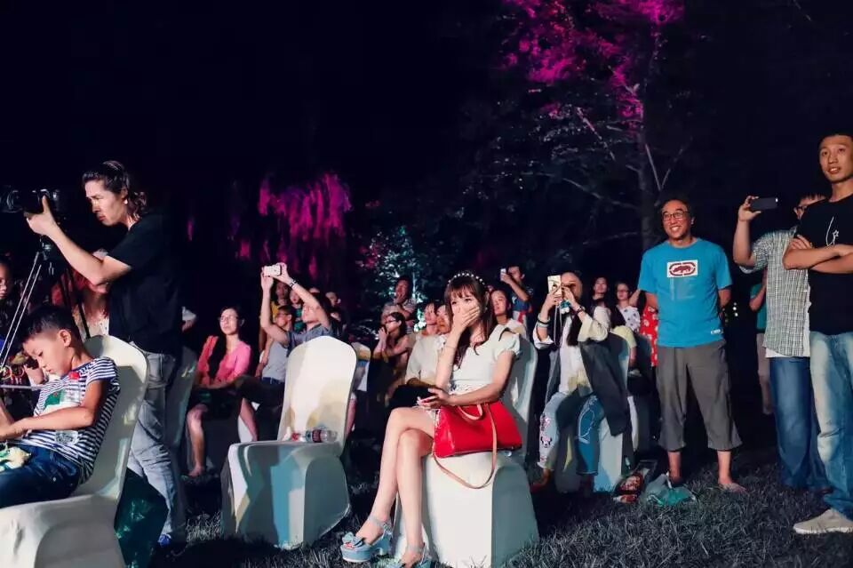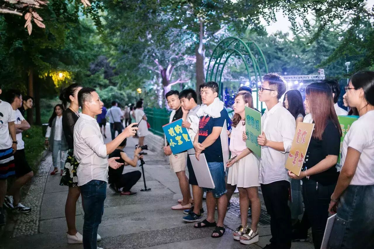 七夕这天,艳阳高照,印着《丽都公园七夕狂欢夜》的易拉宝已经放到公园门口,把戏做足。下午三点,舞蹈演员,萨克斯,管弦乐队开始整体彩排,六点半彩排基本完毕,天南海北过来的朋友们祝福视频录制完毕,不知情的路人已经入座,所有人开始静候博思。