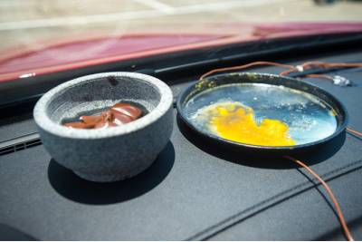 中控台上放置在容器中的生鸡蛋也变成了半熟的煎鸡蛋,巧克力块已完全化成了液体,车内气温的高热由此可见一斑。不过,身着专业防晒工程师进入车内后,还是成功启动了这辆高温炙烤的博越,并在开启空调制冷5分钟后,车内温度迅速降至26°C。